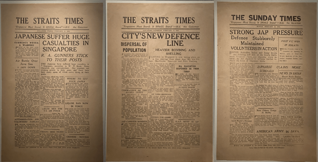 Also at the museum are copies of the front page of the Straits Times for the last 3 days of the Battle of Singapore. Little did the public know that by 6:20pm on 15 February 1942, the British signed the unconditional surrender.